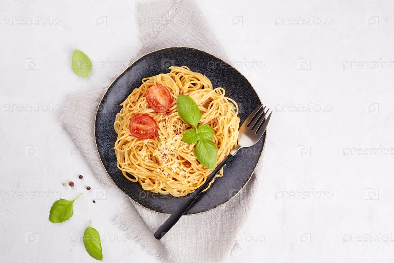 Традиционные итальянские макароны спагетти с помидорами, томатным соусом, базиликом на темной тарелке на светло-сером фоне