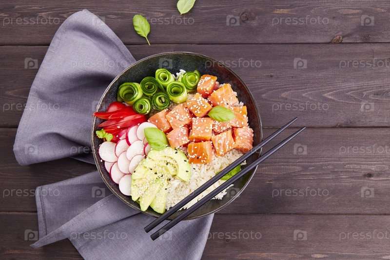 Поке боул с лососем, рисом, авокадо, огурцом, редисом, перцем, кунжутом