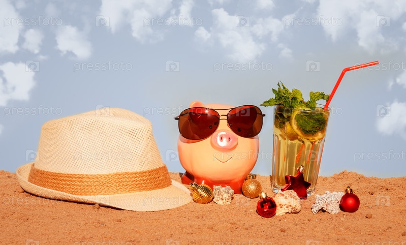 Шляпа, копилка с очками, рождественские украшения и коктейль мохито на пляже