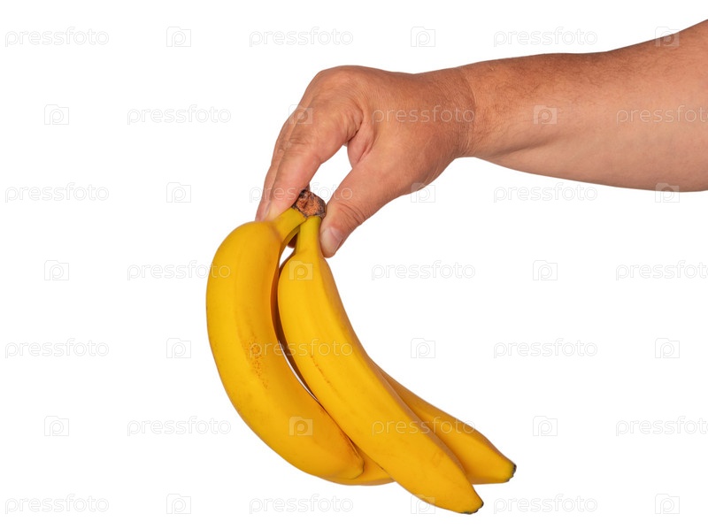 Мужские пальцы держат связку бананов. Изолированные на белом фоне
