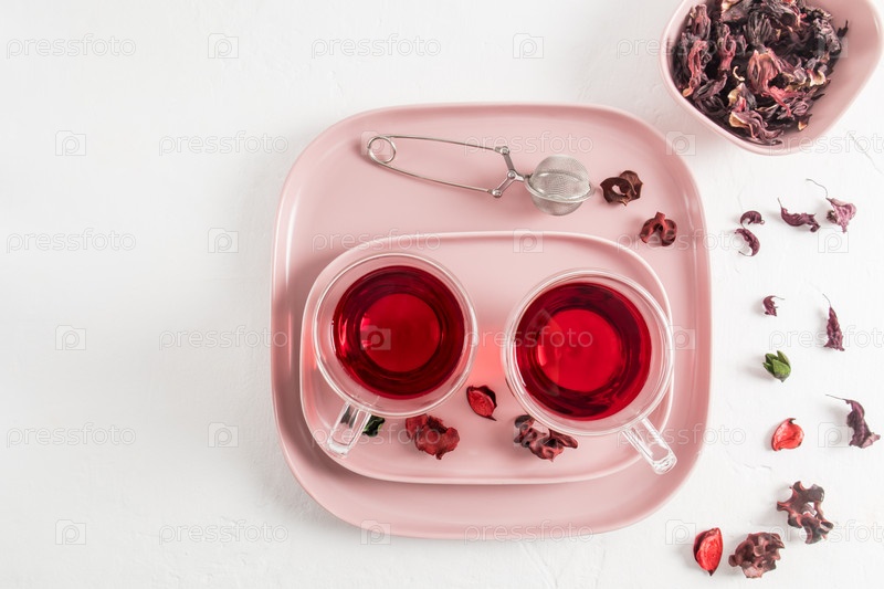 Две современные стеклянные чашки ароматного здорового розового чая гибискуса на розовом керамическом подносе. вид сверху. белый фон
