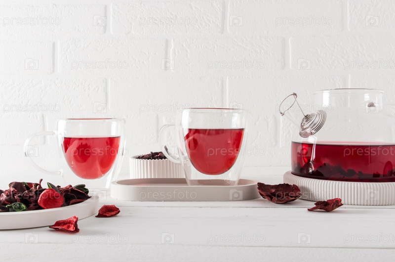 Чайная церемония. чайник и две современные стеклянные чашки с двойным дном с чаем из розы гибискуса на фоне стены из белого кирпича