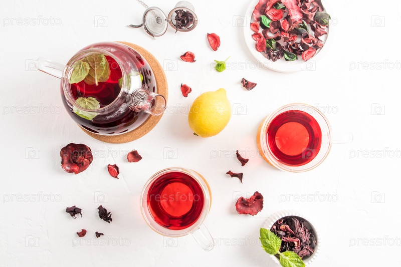 Вкусный ароматный чай из лепестков розы гибискуса в чайнике с листьями мяты и лимоном. лечебный чай от гриппа и простуды. вид сверху. плоский стиль