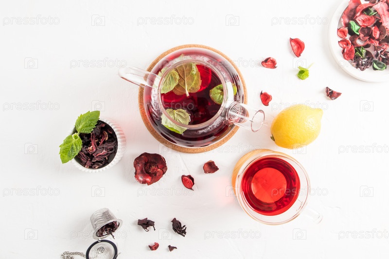 Чайник свежесваренного чая из гибискуса с листьями мяты и ломтиками лимона, стеклянная чашка с чаем из лепестков розы из гибискуса на белом фоне