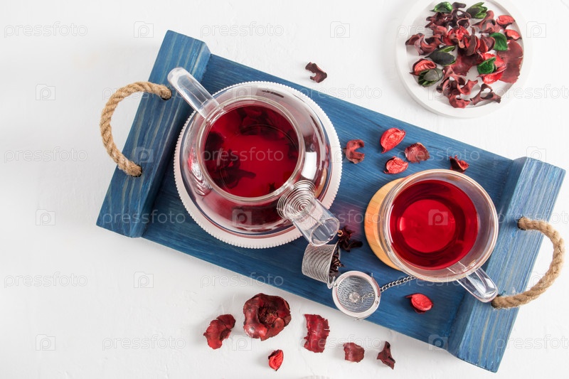 Вид сверху на деревянный синий поднос со стеклянным чайником и чашкой чая из красного гибискуса. полезный чай на завтрак