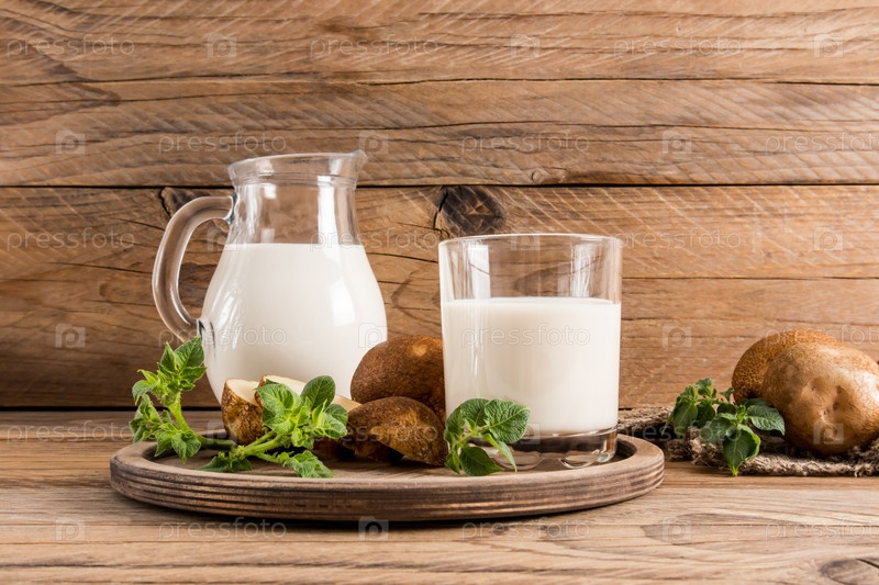 Кувшин и стакан картофельного молока на деревянном подносе на деревенском столе с картофельными листьями и клубнями. растительное молоко