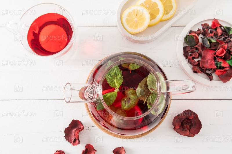 Вид сверху на чайник со свежезаваренным чаем из лепестков розы гибискуса и листьями мяты. лимон для улучшения вкуса и витаминов. белый деревянный стол