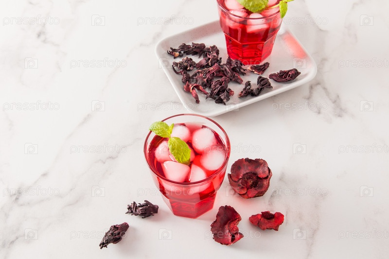 Охлажденный, утоляющий жажду чайный напиток из гибискуса в стеклянных стаканах со льдом на мраморном столе