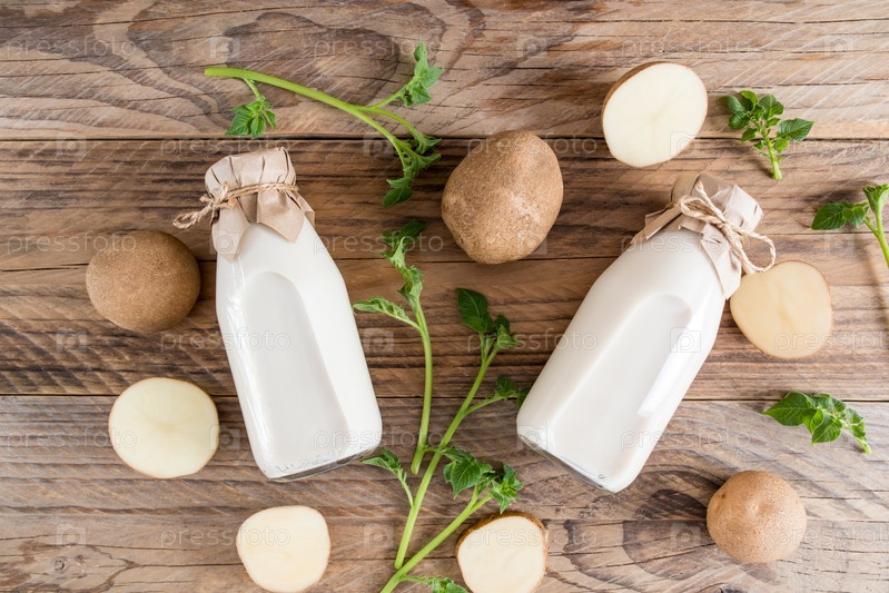 Вид сверху на деревянный деревенский стол с бутылками фермерского натурального растительного молока из картофеля. клубни картофеля. альтернативное молоко