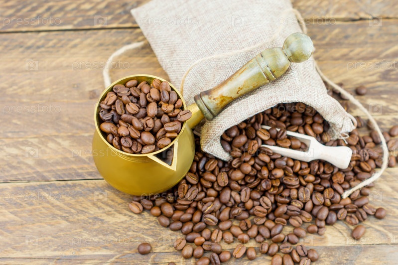 Медный турок с кофейными зернами на коричневом деревянном столе с сумкой и разбросанными кофейными зернами