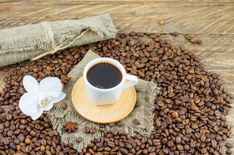 Чашка свежеприготовленного ароматного кофе на деревянном столе с цветком орхидеи и кофейными зернами. состав утреннего кофе в деревне