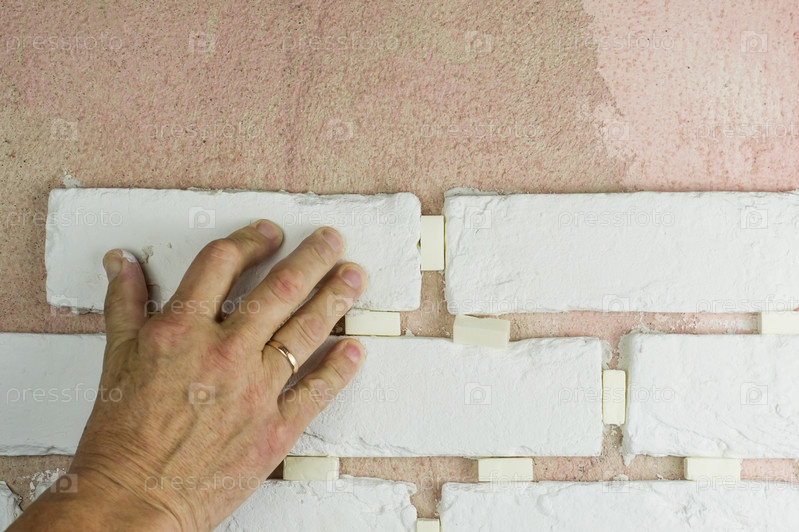 Рука работника прижимает декоративную плитку к отделочной стене на растворе. технология укладки плитки