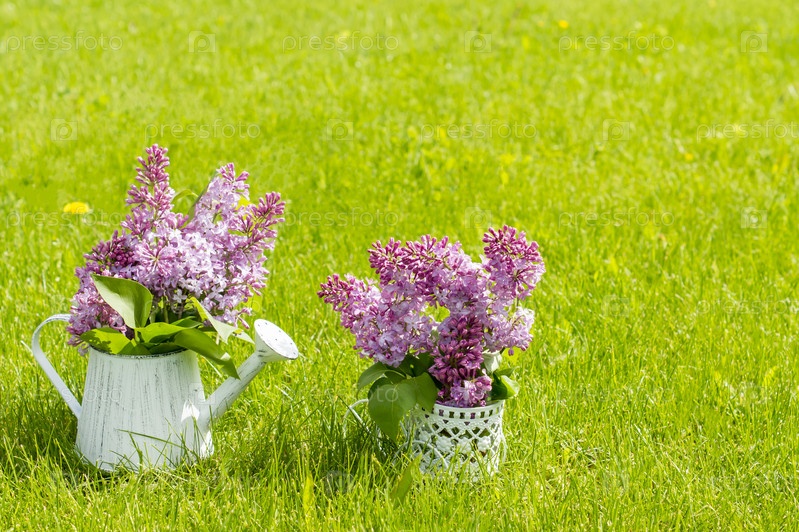Декоративная композиция загородного дома. мини банка с букетом сирени и мини велосипед с ветками сирени на переноске. зеленый фон