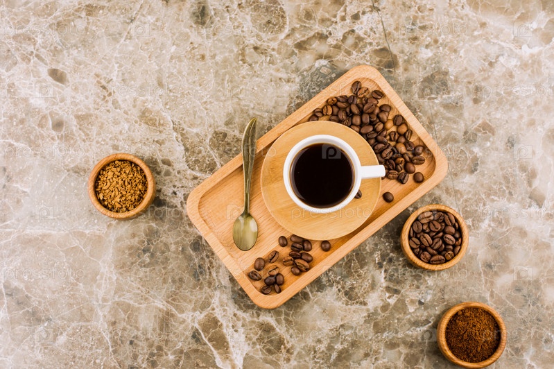 Вид сверху на деревянный поднос с чашкой ароматного кофе и деревянные миски с различными видами кофе. мраморный фон