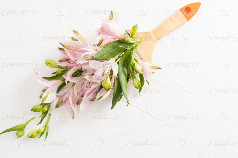 Красивые весенние цветы альстромерии в композиции с кистью. креативная цветочная окраска. вид сверху. белый фон