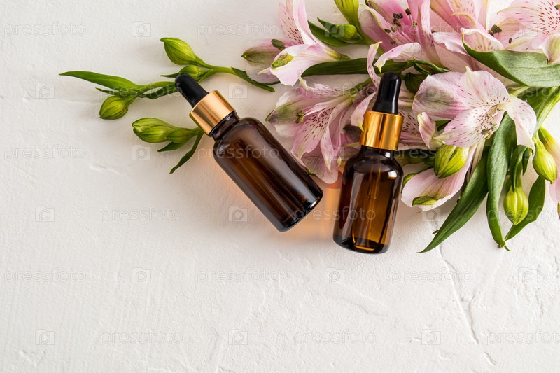 Косметическое масло, сыворотка для ухода за кожей лица и тела в двух флаконах на фоне весенних цветов. натуральный органический продукт. копия пространства