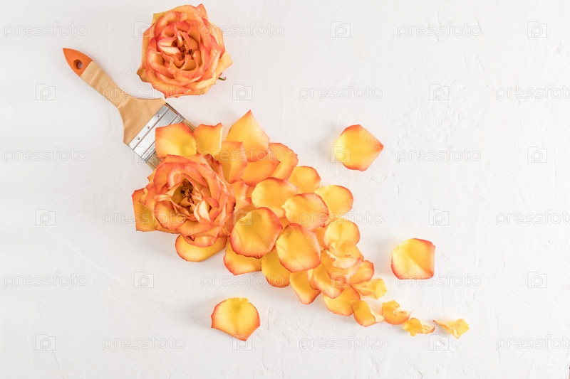 Творческая композиция с кистью и лепестками оранжевой розы на белом фоне. концепция - раскрасить жизнь яркими красками