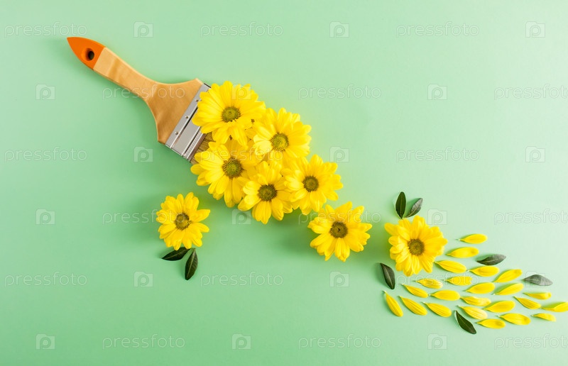 Творческая композиция с желтыми цветами и кистью весенняя пора отмерла. вид сверху. плоская укладка. пастельный фон