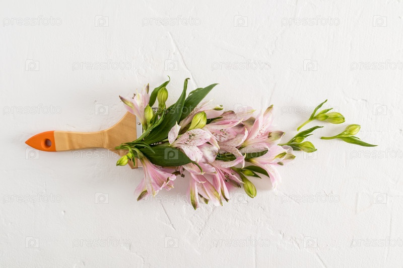 Красивые весенние цветы альстромерии в композиции с кистью. креативная цветочная окраска. вид сверху. белый фон