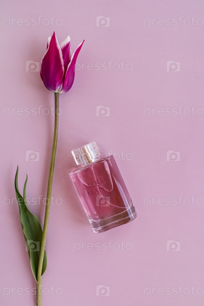 Вертикальный сиреневый фон с красивым весенним тюльпаном и хрустальной бутылкой духов или воды. вид сверху. копия пространства