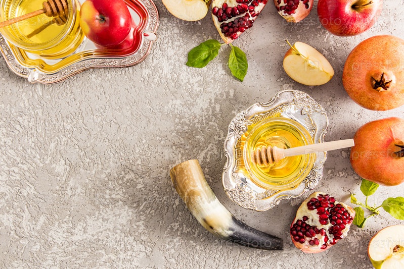 Серебряная чаша с медом, гранатом, яблоками и рогом на сером бетонном фоне. праздничная композиция Новый год Рош ха-Шана