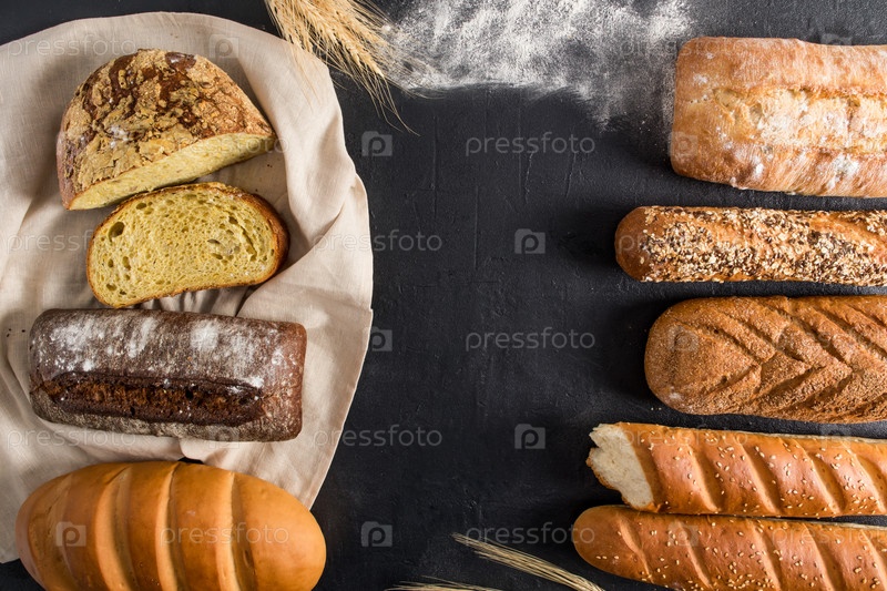 Ассортимент домашнего хлеба на черном фоне, льняное полотенце с копией пространства. вид сверху