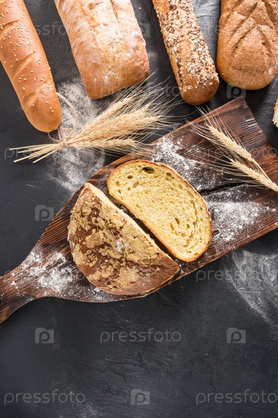 Вертикальный плоский вид с копией пространства на ассортименте свежеиспеченного хлеба в пекарне. черный фон с разбросанной мукой