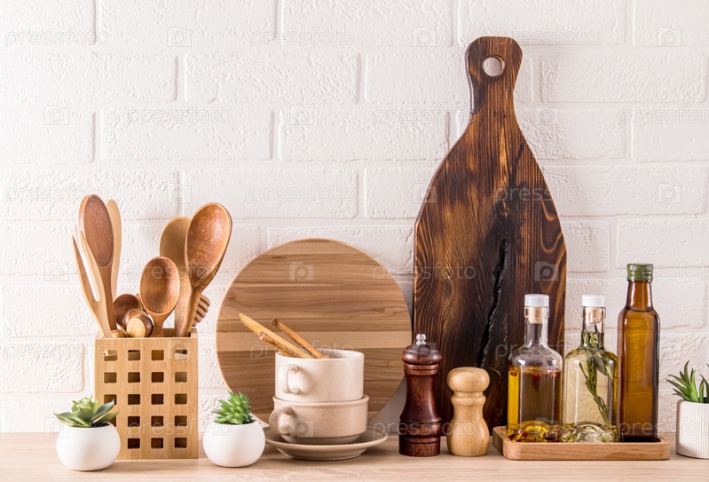 Вид спереди на современную столешницу с множеством различных кухонных принадлежностей для приготовления пищи. экологически чистая кухня