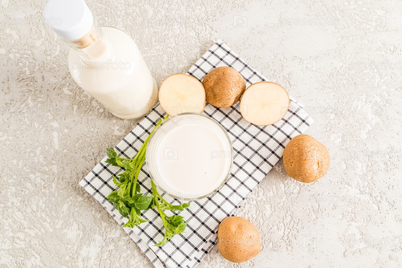 Вид сверху на полный стакан картофельного молока. альтернатива без молока. растительное веганское молоко. Вегетарианская пища