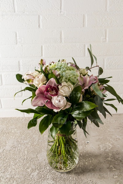Шикарный букет роз и гортензий в стеклянной вазе стоит на столе у белой кирпичной стены. Идеальный подарок для близких