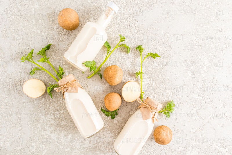 Вид сверху на бетонный фон с несколькими бутылками растительного картофельного молока и лежащими клубнями картофеля. зеленые листья и ломтики картофеля