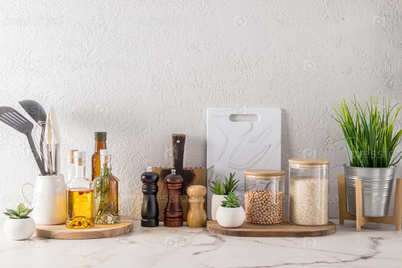 Стильный белый кухонный фон с посудой и контейнерами для хранения различных специй и продуктов