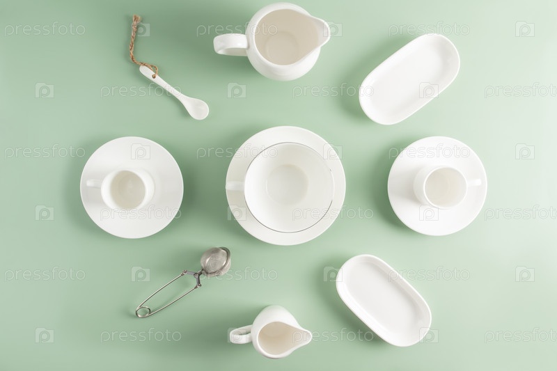 Белые керамические и фарфоровые чашки, блюдца, молочник разной формы на светло-зеленом фоне. вид сверху. плоская кладка