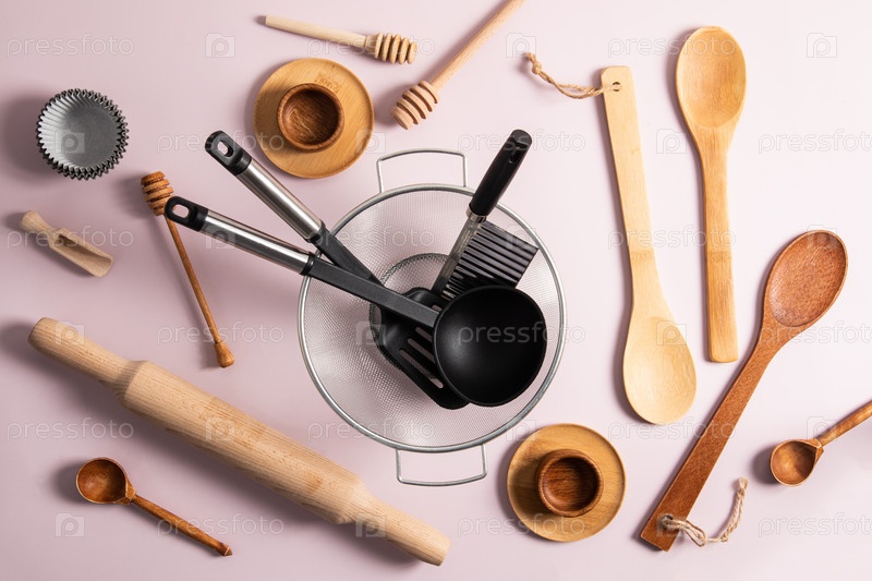 Современный кухонный фон. разнообразная кухонная утварь на светлом пастельном фоне. вид сверху. плоская кладка