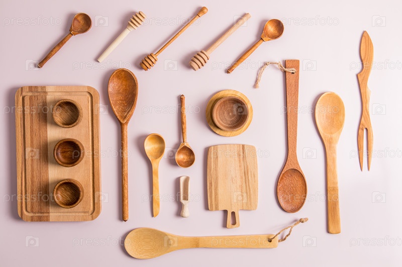 Вид сверху на набор различной деревянной и бамбуковой кухонной утвари. плоская планировка. экологически чистые столовые приборы. ноль отходов