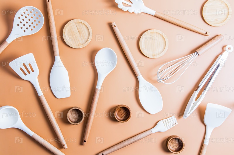 Коллекция белых силиконовых инструментов для приготовления пищи на кухне. вид сверху. плоская укладка. бежевый фон