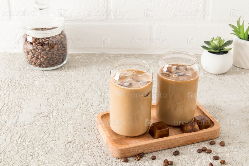 Два современных стакана в форме банки холодного кофе латте, шоколадного напитка или мокко на деревянном подносе напротив стены из белого кирпича