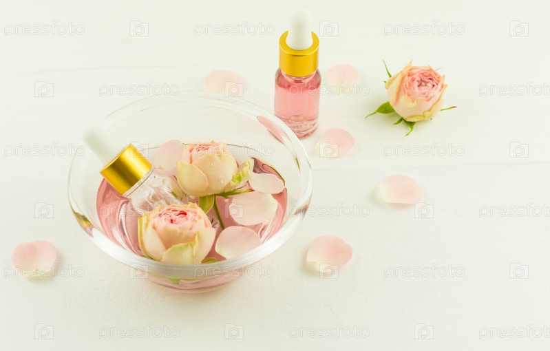 Косметическое розовое масло в бутылках с пипеткой в стеклянной миске на белом деревянном столе. концепция естественной заботы о себе