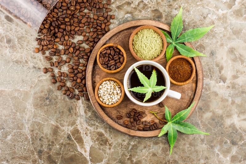 Кофейные зерна, чашка свежесваренного кофе с коноплей, семенами морихуаны и листьями на подносе. вид сверху