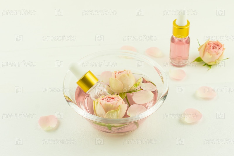 Стеклянная чаша с розовой водой, цветами и лепестками роз, косметические флаконы с цветочным маслом зфира. ароматерапия, антистресс