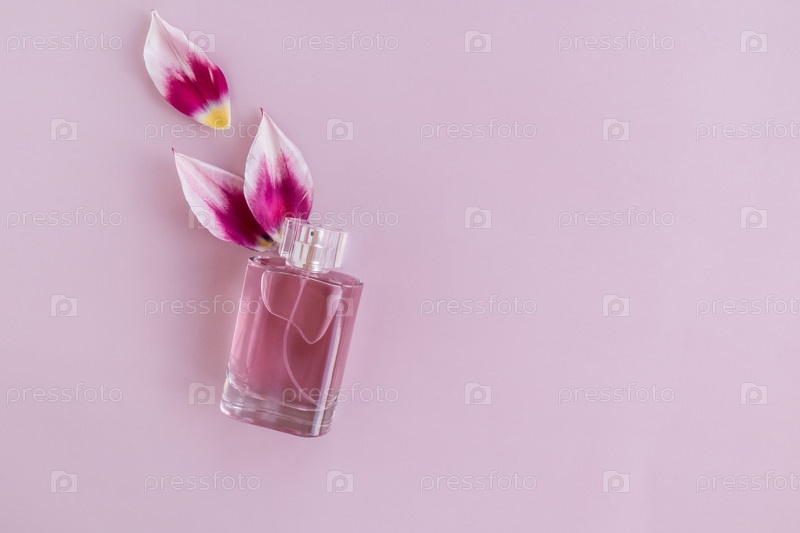 Прозрачная бутылка духов или туалетной воды для боулинга на фиолетовом фоне с лепестками тюльпана. вид сверху. копия пространства