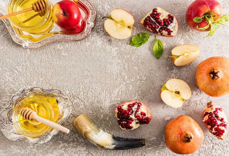 Плоская планировка, вид сверху, серый бетонный фон с яблоками, гранатом, рогом, медом в серебряной миске. Новый год Рош ха-Шана