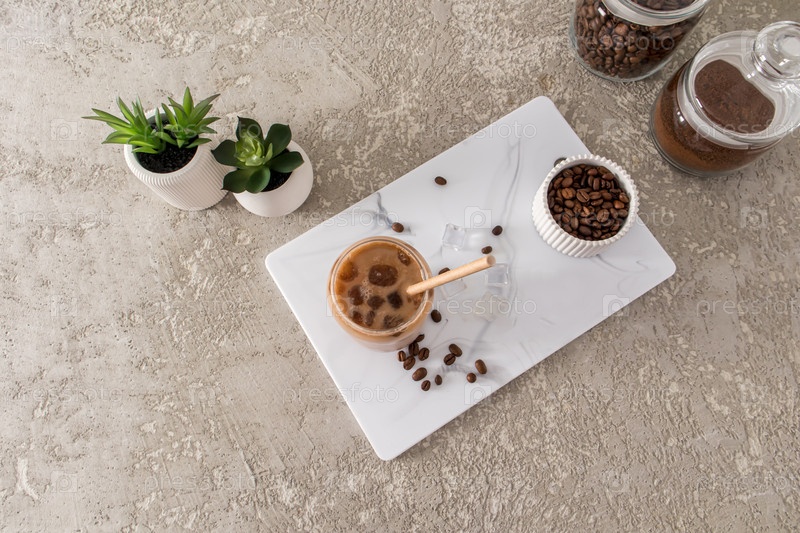 Кофе латте, мокко с молоком в современном стакане в виде банки на белой мраморной доске и стол из бетона. трендовый напиток. вид сверху
