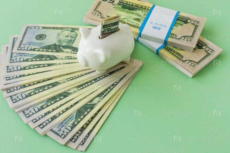 Банкнота в 50 долларов и две пачки долларов на зеленом фоне. копилка со сложенной купюрой
