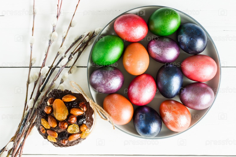 Вид сверху на большую тарелку с пасхальными разноцветными яйцами и веточками ивы. белый деревянный фон
