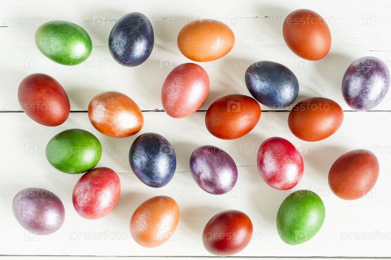 Праздничный пасхальный фон. разноцветные крашеные яйца разбросаны по деревянному белому столу. вид сверху