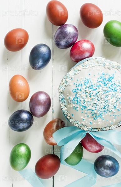 Вид сверху на большой домашний кекс с белой глазурью и голубыми круглыми украшениями, разноцветные яйца. концепция праздника Пасхи