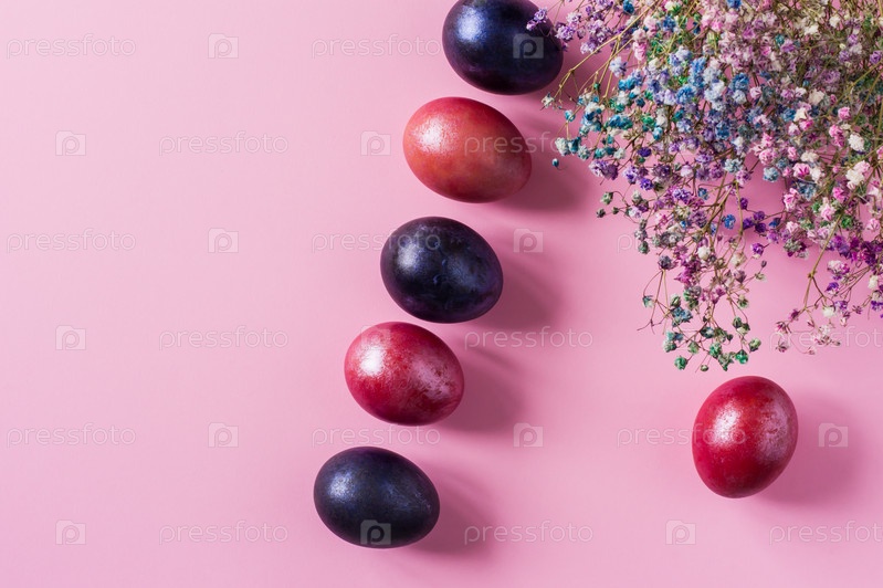 Вид сверху на пасхальные красочные яйца и весенние цветы, выложенные в ряд. Мини пасхальная композиция