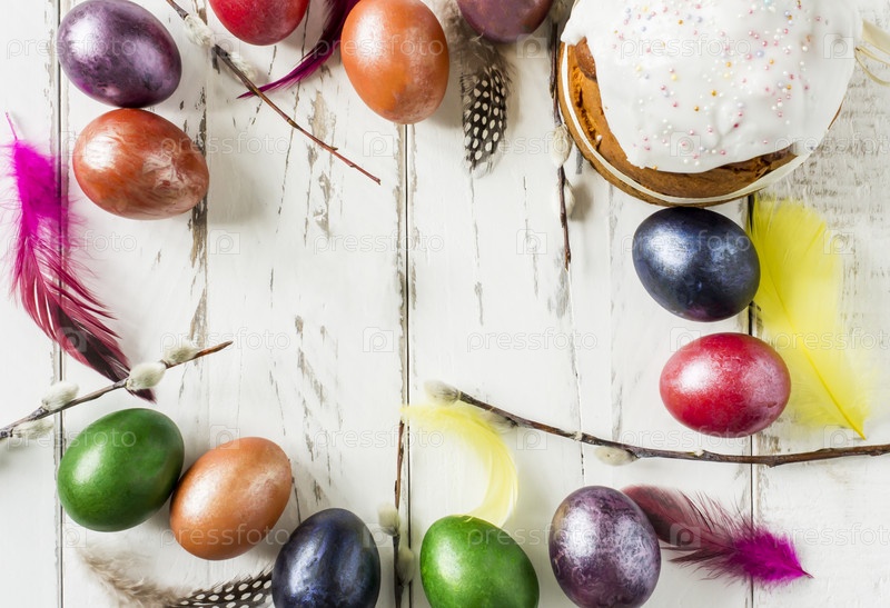 Праздничный пасхальный фон. торт с глазурью, разноцветные яйца и перья, веточки ивы на белом деревянном столе