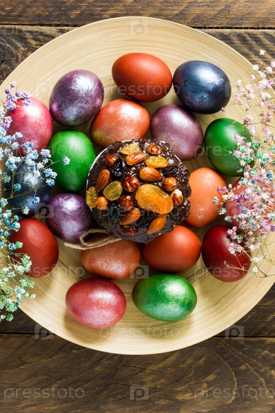 Пасхальный кулич с сухофруктами и орехами на большой деревянной тарелке с крашеными яйцами. вид сверху. вертикальное изображение